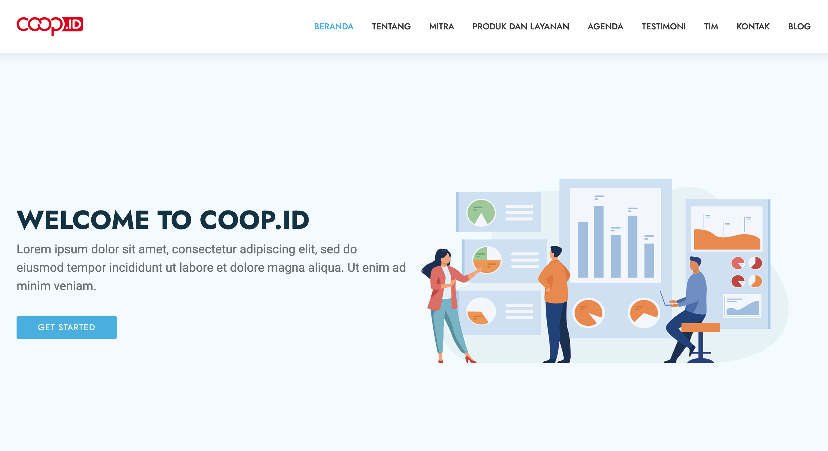 Menyediakan fitur-fitur utama yang biasanya dibutuhkan koperasi seperti laman berita, galeri foto, video dan lainnya. Tampilan otomatis menyesuaikan antara desktop dan ponsel.